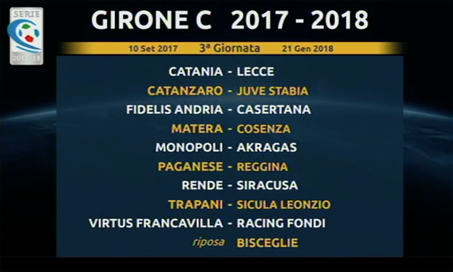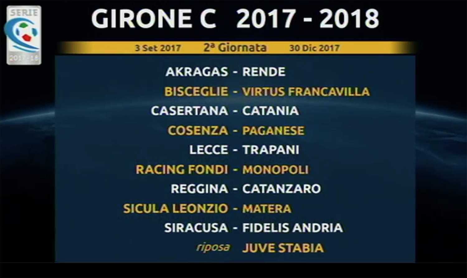 Queste comunque le tre giornate del girone C con la Casertana che esordirà a Catanzaro. La settimana successiva sarà invece impegnata in casa contro il Catania. La terza ad Andria. Queste le prime tre giornate: