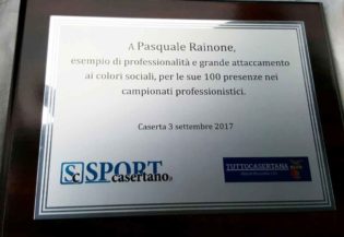 Ieri sera Pasquale Rainone ha festeggiato le 100 presenze nei campionati professionistici. Un bel traguardo per il difensore napoletano che con la Casertana ha collezionato 64 presenze solo in campionato (72 complessive tra Coppa Italia e playoff). La nostra redazione, insieme a quella di Tuttocasertana, ha voluto omaggiare il calciatore con una simbolica targa ricordo. “A Pasquale Rainone esempio di professionalità e grande attaccamento ai colori sociali per le sue 100 presente nei campionati professionistici”. Questa la dedica per uno che ha deciso di sposare in pieno il progetto rossoblù rifiutando anche una proposta dalla serie A rumena. “Mi hanno fatto un paio di volte questa proposta – ha detto – ma ho declinato per restare qui”.