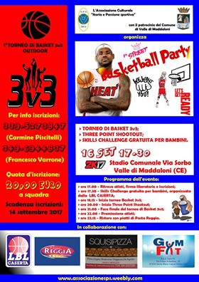 Si svolgerà domani 16 settembre dalle 16 alle 23 a Valle di Maddaloni il 1° Street Basketball Party. L’evento è ad ingresso gratuito e prevede: una sessione di giochi per bambini; un torneo di basket 3v3 e un torneo di tiro da 3. Al termine dell’evento ci saranno le premiazioni delle squadre finaliste e il ristoro con un piatto di Pasta Reggia per tutti i partecipanti al torneo. L’evento è organizzato dall’Associazione Culturale Storia e Passione sportiva, con il patrocinio del Comune di Valle di Maddaloni e la collaborazione di LBL CASERTA, PASTA REGGIA, SQUISIPIZZA (Via Ortole, Valle di Maddaloni), A.S.D. GYM FIT (Santa Maria Capua Vetere).