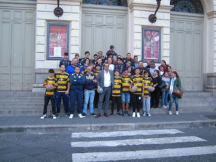 Puntuale alle ore 17 è scattata “L’ora del Rugby” anche a Santa Maria Capua Vetere, così come in tante città campane e a Piazza Bovio il Clan, una ventina di ragazzi delle giovanili (U16 e U18) hanno cominciato a giocare, in una specie di allenamento in uno dei salotti della città del Foro. L’obiettivo diffondere il rugby anche nelle realtà periferiche. Una buonissima iniziativa del comitato campano della Federazione Italiana Rugby. Ai ragazzi, agli allenatori Francesco Di Rienzo e Francesco Iannotta e ai dirigenti gialloblù Casino, Piccolo e Maio sono arrivati i saluti e l’incitamento del sindaco Mirra che si è intrattenuto in qualche passaggio dell’ovale con i ragazzi ed il presidente Casino per poi fare una foto di gruppo con i partecipanti alla manifestazione sulle scale del Teatro Garibaldi. “Domani contro la squadra di Roma avete una partita importante. Una sfida tra i due ‘colossei’ più importanti della storia, cercate di dare il massimo per superare l’ostacolo”, ha affermato il sindaco di Santa Maria Capua Vetere nel rivolgersi ai giocatori dell’Under16, impegnata nel secondo turno dei barrages per l’accesso al campionato nazionale Elite di categoria. Poco dopo un’altra dimostrazione in Villa Comunale, con tanti ragazzini e ragazzine che si sono avvicinati per provare i passaggi e le touche, tante foto e la promessa di rivedersi sul campo.
