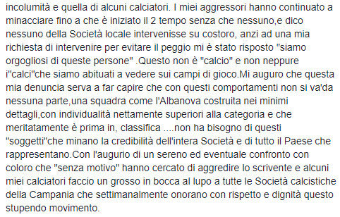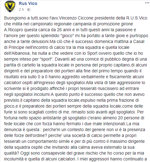 Buongiorno a tutti, sono l’avv. Vincenzo Ciccone presidente della R.U.S. Vico che milita nel campionato regionale campania di promozione girone A. Ricopro questa carica da 26 anni e in tutti questi anni la passione e l’amore per questo splendido “gioco” mi ha portato a tante gioie e purtroppo anche a tante delusioni.Ma ciò che è successo domenica mattina a Casal di Principe nell’incontro di calcio tra la mia squadra e quella locale dell’Albanova, ha nulla a che vedere con lo Sport ovvero quello che io ho sempre inteso per “sport”. Davanti ad una cornice di pubblico degna di una partita di cartello la squadra locale in persona del proprio capitano, di alcuni dirigenti e del preparatore dei portieri alla fine del primo tempo quando il risultato era sullo 0 a 0 hanno aggredito verbalmente e fisicamente alcuni calciatori ospiti all’ingresso degli spogliatoi. Alla vista di tale aggressione lo scrivente si è prodigato affinché i propri tesserati riuscissero ad entrare negli spogliatoi incolumi. A questo punto è successo quello che non avevo previsto, il capitano della squadra locale, espulso nella prima frazione di gioco, e il preparatore dei portieri sempre della squadra locale, come delle furie si sono scagliati contro di me, rimasto solo avanti agli spogliatoi. Per fortuna nello spazio antistante gli spogliatoi c’erano almeno 20 persone di fede locale che con forza hanno fermato i due male intenzionati. La mia denuncia è questa : perché in un contesto del genere non vi è la presenza delle forze dell’ordine? perché una società di calcio permette a propri tesserati un comportamento simile e per di più contro il massimo dirigente della squadra ospite che invitando alla calma aveva esternato la sua qualità? Oggi sono consapevole del grave rischio che ho corso per la mia incolumità e quella di alcuni calciatori. I miei aggressori hanno continuato a minacciare fino a che è iniziato il 2 tempo senza che nessuno,e dico nessuno della Società locale intervenisse su costoro, anzi ad una mia richiesta di intervenire per evitare il peggio mi è stato risposto “siamo orgogliosi di queste persone” .Questo non è “calcio” e non neppure i”calci”che siamo abituati a vedere sui campi di gioco.Mi auguro che questa mia denuncia serva a far capire che con questi comportamenti non si va’da nessuna parte,una squadra come l’Albanova costruita nei minimi dettagli,con individualità nettamente superiori alla categoria e che meritatamente è prima in, classifica ….non ha bisogno di questi “soggetti”che minano la credibilità dell’intera Società e di tutto il Paese che rappresentano. Con l’augurio di un sereno ed eventuale confronto con coloro che “senza motivo” hanno cercato di aggredire lo scrivente e alcuni miei calciatori faccio un grosso in bocca al lupo a tutte le Società calcistiche della Campania che settimanalmente onorano con rispetto e dignità questo stupendo movimento.