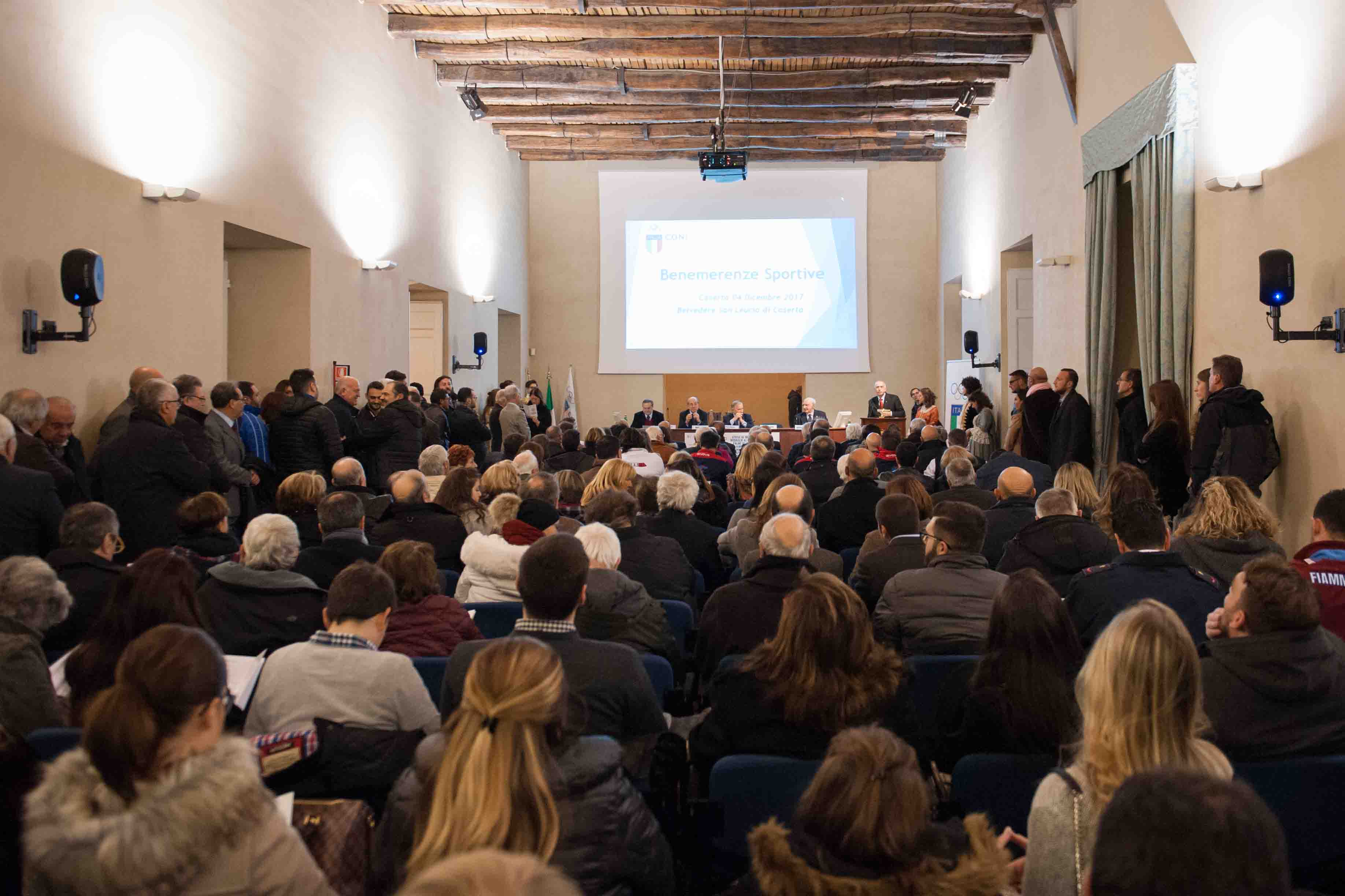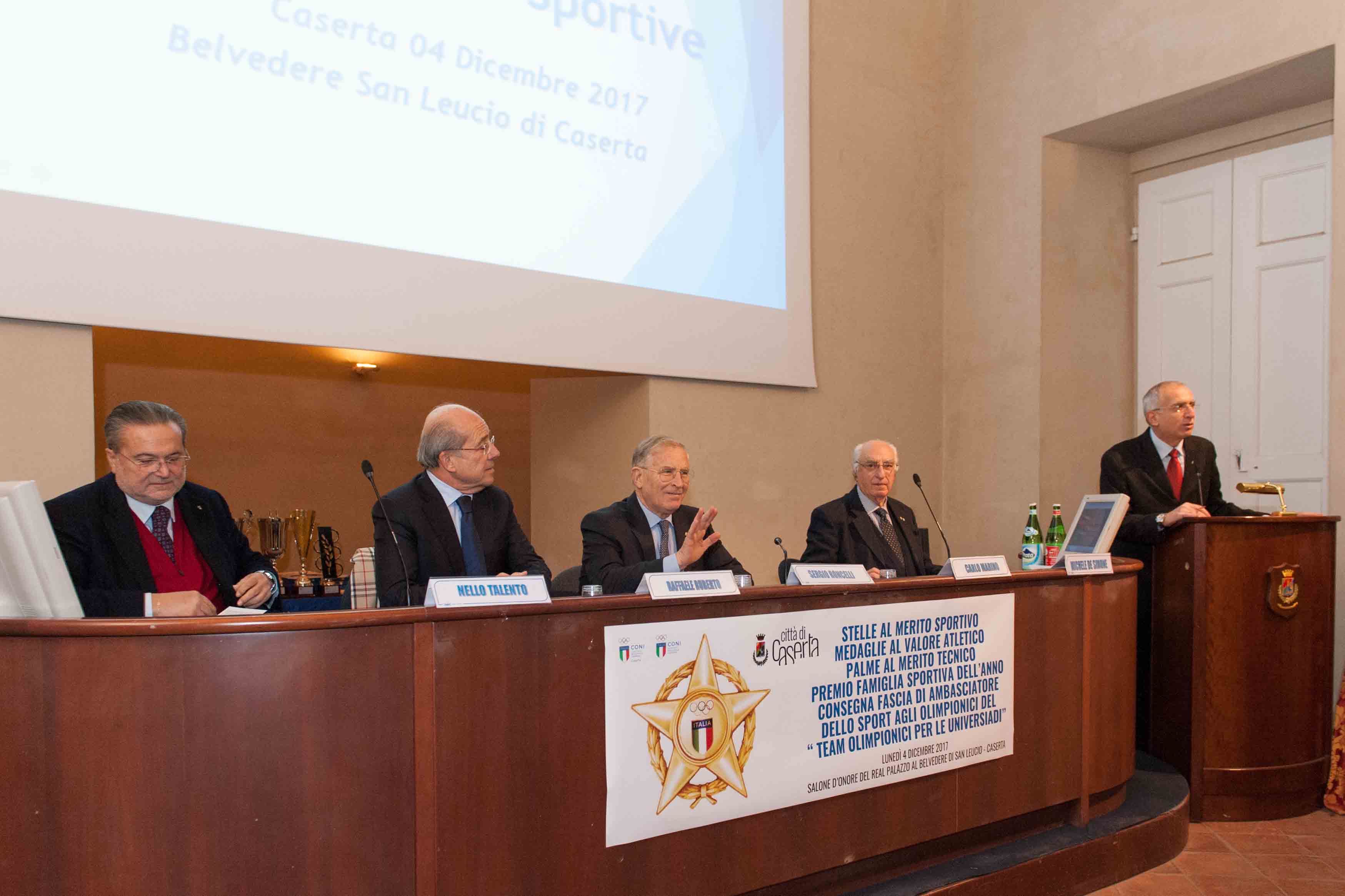 Oltre sessanta tra campioni italiani, europei e mondiali in passerella nel Salone d’Onore del Palazzo Reale al Belvedere di San Leucio a Caserta, scelta dal Coni a conclusione di una intensa stagione agonistica, per la consegna delle Stelle al Merito Sportivo, delle Medaglie al Valore Atletico e delle Palme al Merito Tecnico, assegnate per il biennio 2016/2017 a dirigenti, atleti, tecnici e società sportive meritevoli di Terra di Lavoro.