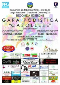 L’Associazione CasertAzione promuove ed organizza, per il giorno domenica 25 febbraio 2018, la seconda edizione della manifestazione sportiva “Gara Podistica Casollese – dieci chilometri”, evento riproposto dall’associazione visto il successo dello scorso anno che ha entusiasmato circa cinquecento concorrenti provenienti da tutta la Regione Campania, lungo un percorso che si snoda nel territorio tifatino alla riscoperta di luoghi unici, immersi in un paesaggio incontaminato. Il gruppo conta circa quaranta persone tutte impegnate per la riuscita di un evento che è in fase di organizzazione ormai da mesi, gruppo coordinato dal presidente Francesco Guida, giovanissimo casollese sempre attento alla realtà locale in maniera molto attiva e presente sul territorio.