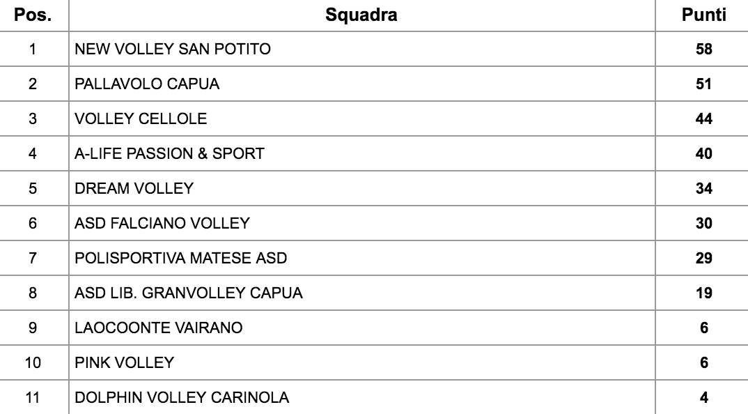 Concluso ufficialmente anche il campionato di Seconda Divisione. New Volley San Potito e Pallavolo Capua hanno tagliato il traguardo della promozione in Prima già da qualche settimana. La compagine dell’alto casertano ha chiuso con un vantaggio di ben sette punti sulle calene con una sola sconfitta in venti partite disputate. Due invece per il Capua che ha tenuto a debita distanza il Volley Cellole. Nell’ultima turno di campionato successi esterni di Vairano (che lascia così al Carinola l’ultima posizione in graduatoria), San Potito a Curti in casa del Pink Volley e Capua nel derby contro il Granvolley. Vince il Cellole contro il Dream Volley mentre all’appello manca Polisportiva Matese-A-Life Passion & Sport in programma il 23 maggio. Le matesine battendo le avversarie chiuderebbero l’annata al sesto posto scavalcando il Falciano (30) che ha un punto di vantaggio. E a proposito di Seconda Divisione, scendono dalla Prima Normanni Pallavolo Aversa e Calvi Risorta.