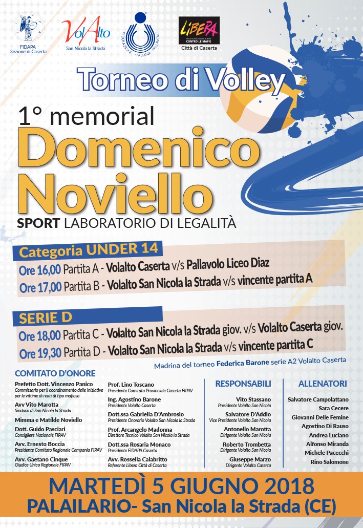 Alle ore 21.00 poi le premiazioni a cura del Comitato d’Onore della manifestazione composto, tra gli altri, da Mimma e Matilde Noviello, figlie di Domenico Noviello, dal Prefetto Dott. Vincenzo Panico, Commissario per il coordinamento delle iniziative per le vittime di reati di tipo mafioso, dal Dott. Guido Pasciari, consigliere nazionale FIPAV, dall’Avv. Ernesto Boccia, Presidente del Comitato Regionale FIPAV Campania, dal Prof. Lino Toscano, Presidente del Comitato Provinciale FIPAV di Caserta, dalla Dott.ssa Rosaria Monaco, presidente della FIDAPA Caserta, dall’Avv. Rossella Calabritto, referente Ass. “LIBERA” Città di Caserta, dall’Avv. Gaetano Cinque, Giudice Unico Regionale FIPAV.