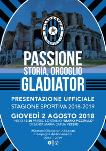SANTA MARIA CAPUA VETERE – L’A.S.D. Gladiator 1924 è lieto di annunciare che giovedì 2 agosto 2018 si svolgerà la presentazione ufficiale dello staff e della squadra. L’appuntamento per tutti i tifosi è orientativamente alle 19.30 nella splendida cornice dello stadio “Mario Piccirillo” di Santa Maria Capua Vetere. La presentazione arriva al culmine di un pomeriggio di totale condivisione neroazzurra, infatti l’allenamento del pomeriggio, a partire dalle 17.30, si svolgerà a porte aperte. Sarà questo il primo abbraccio tra i protagonisti del Gladiator ed i tanti sostenitori che hanno un legame viscerale con i colori neroazzurri. Inoltre, in occasione della manifestazione, sarà possibile avere tutte le informazioni in merito alla campagna abbonamenti #SostienilGladiator_Abbonati, che parte ufficialmente il 1 agosto. Tutta la cittadinanza è invitata a partecipare ed a supportare il Gladiator