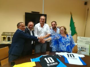 SANTA MARIA CAPUA VETERE – La nuova era del Gladiator ha avuto inizio. Stamattina, presso l’ufficio del sindaco di Santa Maria Capua Vetere, è avvenuto il battesimo della nuova società, sorta dal connubio tra Giacomo De Felice e la famiglia Aveta, nelle persone di Salvatore e Mattia Aveta. A “benedire” il matrimonio il sindaco Antonio Mirra e l’assessore con delega allo sport Claudia Imparato, mentre in rappresentanza del settore giovanile neroazzurro era presente il dirigente Gaetano Di Monaco. Grande entusiasmo per la presentazione della proprietà e delle nuove divise ufficiali, che domani verranno presentate al pubblico nella presentazione ufficiale in programma alle 19.30 allo stadio “Mario Piccirillo” di Santa Maria Capua Vetere.