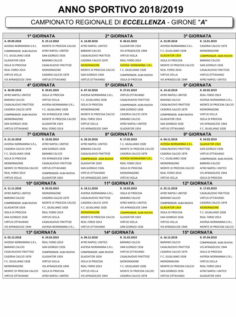 Sorteggiati oggi sulla nave Msc attraccata nel porto di Napoli i calendari di Eccellenza per la stagione 2018/2019. Attesa per le quattro formazioni casertane Albanova, Aversa Normanna, Gladiator e Mondragone che si affronteranno, tra andata e ritorno, dodici volte in campionato. Si inizia col 16 settembre, la seconda giornata. Mondragone-Aversa Normanna. Nella successiva ci sarà invece Gladiator-Albanova. Ottava e nova con Albanova-Aversa e Aversa-Gladiator. Arriviamo così al 18 novembre quando il Mondragone ospiterà l’Albanova mentre il Gladiator, sette giorni più tardi il Mondragone al ‘Piccirillo’. La stagione regolare terminerà il 7 aprile 2019 mentre si giocherà fino al 23 dicembre (sedicesima giornata) prima della sosta per le festività natalizie. Il giorno dell’Epifania invece tutti in campo per la prima del nuovo anno.
