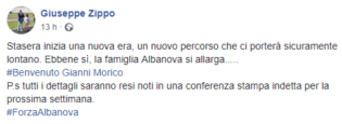 INGRESSO SOCIETARIO. Ma non solo calciatori, il presidente Giuseppe Zippo ha ufficializzato ieri l’ingresso in società dell’imprenditore del pane Gianni Morico. Questo il post pubblicato sulla bacheca: “Stasera inizia una nuova era, un nuovo percorso che ci porterà sicuramente lontano. Ebbene sì, la famiglia Albanova si allarga…..#Benvenuto Gianni Morico. P.s tutti i dettagli saranno resi noti in una conferenza stampa indetta per la prossima settimana. #ForzaAlbanova”. Vari “ingaggi” per una società che adesso cambia i suoi programmi e punta ai primi posti della classifica.