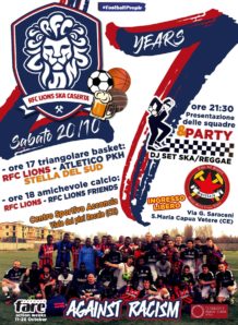 E sono sette! La RFC Lions Ska Caserta festeggia il settimo anno di attività e lo fa organizzando un’intera giornata da vivere tra sport, musica e aggregazione. Sabato 20 ottobre, infatti, il collettivo RFC Ska Lions ha preparato un bel giorno di festa che parte sui campi di calcio e di basket del Cento Sportivo “Acconcia” di Recale e prosegue in serata alla Casa del Popolo “Spartaco” di S. Maria C.V.