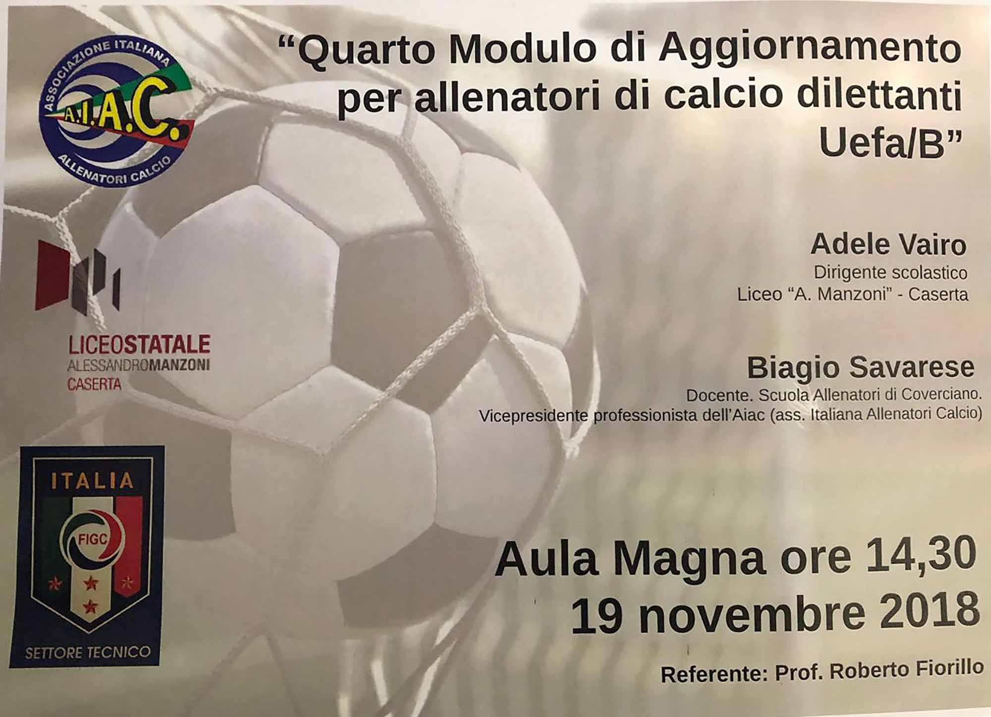 Si svolgerà lunedì 19 novembre alle 14.30 presso l’Aula Magna del Liceo Statale Manzoni di Caserta il quarto modulo di aggiornamento per allenatori di calcio dilettanti Uefa/B. Organizzato dal professore Roberto Fiorillo, il corso vedrà la partecipazione di Biagio Savarese docente della scuola allenatori di Coverciano nonchè vice Presidente dell’Aiac (Associazione Italiana Allenatori Calcio). Patrocinato dalla Figc, l’evento si svolgerà al Manzoni di Caserta che da sempre è teatro di manifestazioni del genere. “Un ringraziamento speciale alla Dirigente dottoressa Adele Vairo – ha detto lo stesso Fiorillo – che ha favorevolmente accolto la nostra proposta. Sarà un momento di confronto con tutti i giovani allenatori che hanno il patentino Uefa/B grazie alla presenza di un grande personaggio come Biagio Savarese che condividerà la sua esperienza con noi”.