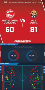 La mappa dei tiri, allegata alla foto, ce lo dice chiaramente: Caserta tira con quasi il 50%, segnando in maniere equilibrata sia da oltre l’arco, che in area o dentro lo ‘smile’.