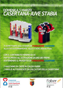 In vista della gara Casertana-Juve Stabia, in programma allo stadio ‘Pinto’ domenica 3 marzo alle ore 18.30, i rossoblu lanciano un’iniziativa di solidarietà. Da questo momento è possibile acquistare presso il Casertana Store i tagliandi (con donazione minima di 1 euro) per partecipare all’estrazione di 5 premi: 3 macchine da caffè firmate Faber e personalizzate con i colori e lo stemma della Casertana FC, e due maglie da gioco rossoblu dei falchetti autografate: quelle di Antonio Floro Flores e Antonio Zito. I tagliandi saranno acquistabili anche domenica 3 marzo presso gli appositi stands che Casamore allestirà presso lo stadio Pinto.