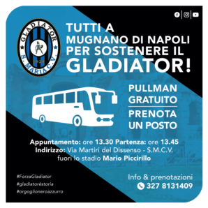 SANTA MARIA CAPUA VETERE – Sale di ora in ora l’adrenalina per il big match di sabato pomeriggio tra Giugliano e Gladiator. Secondo quanto pubblicato sulla pagina ufficiale facebook, la società neroazzurra dei presidenti Mattia Aveta e Giacomo De Felice mette a disposizione pullman gratuiti per tutti i tifosi sammaritani in vista della gara in programma sabato 2 marzo alle 15 allo stadio “Alberto Vallefuoco” di Mugnano di Napoli. L’appuntamento è previsto per le 13.30 fuori lo stadio “Mario Piccirillo”, in Via Martiri del Dissenso a Santa Maria Capua Vetere, con partenza alle 13.45.