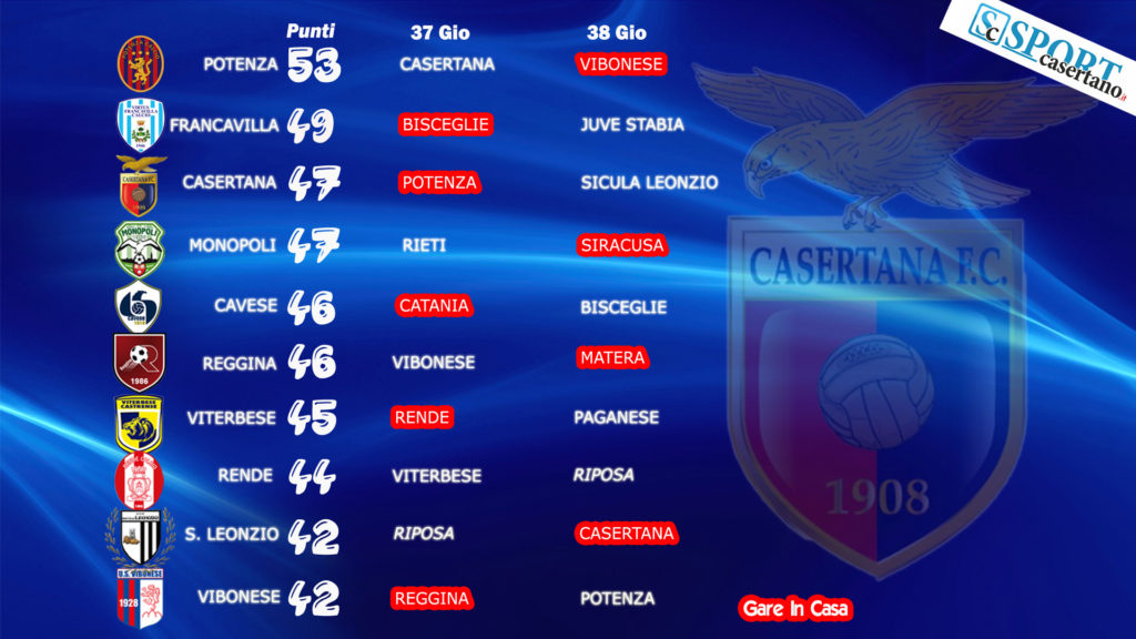 Dieci squadre ancora in attesa di conoscere il proprio destino in chiave playoff. Tre club che nei restanti centottanta minuti faranno di tutto per agguantare almeno l’undicesimo posto (sempre se la Viterbese non vince la Coppa Italia liberando così un altro posto). Potenza già matematicamente qualificato, Francavilla quasi ed entrambe sono in lotta per il quinto posto. I lucani affronteranno Casertana in trasferta e Vibonese in casa. Bisceglie e Juve Stabia per i pugliesi. Casertana e Monopoli sono in lotta per il settimo posto ma proveranno ad attaccare il sesto. Potenza e Sicula Leonzio attendono i falchetti, mentre i biancoverdi andranno a Rieti (già salvo) e ospiteranno il Siracusa che si è messo al sicuro dei playout. Un punto in meno per la Cavese che se la vedrà contro il Catania e poi a Bisceglie. La Reggina domenica se la vedrà contro la Vibonese (che si gioca l’ultimissima possibilità di restare in scia dell’undicesima posizione) e poi avrà tre punti a tavolino. Discorso particolare per la Viterbese che come detto è in finale di Coppa Italia e vincendola salterebbe i primi due turni playoff. Rende in casa e Paganese per i gialloblù che devono comunque provare a mettere al sicuro un posto nei playoff. A 44 c’è il Rende che domenica ospita la Viterbese e poi sarà fermo ai box per il turno di riposo. Speranze basse per i calabresi che dovranno vincere nella 37^ e poi sperare in una serie incredibile di risultati. Non è facile neppure per la Sicula che nel prossimo turno osserverà le dirette concorrenti e poi chiuderà contro una Casertana che si giocherà il tutto per tutto in chiave sesta posizione. Sei punti in palio ancora per la Vibonese che dopo il derby con la Reggina andrà a Potenza. Anche in questo caso servirà il massimo e poi sperare. Insomma giochi ancora aperti ma già questa settimana il campionato emetterà i primi verdetti.