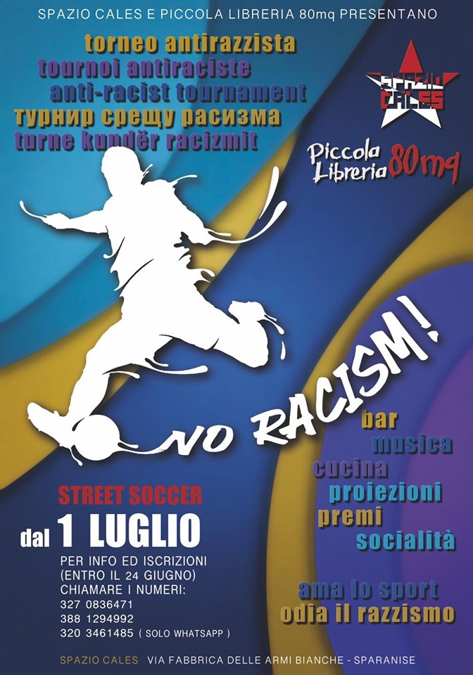 Spazio CALeS e Piccola Libreria 80Mq presentano la Prima Edizione del Torneo Anti-Razzista di Street Soccer, un appuntamento all’insegna dello sport aldilà di ogni barriera e confine, ma anche una serie di iniziative di approfondimento sulle tematiche delle migrazioni, dell’accoglienza e dei diritti calpestati. In contrapposizione a una politica che semina discordia e divisioni tra le classi popolari, che alimenta una guerra tra poveri utile solo a chi detiene il potere, un momento di solidarietà che parte dal linguaggio universale del pallone.
