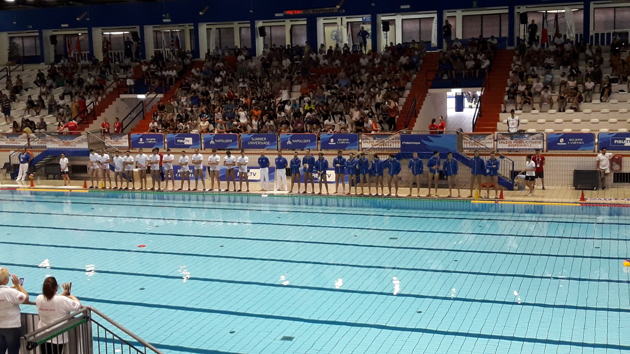 A rompere gli indugi è un rigore di Cannella, Paparic pareggia con una rete dal centro. Le altre reti del 4-3 di parziale sono di Panerai in superiorità, Cannella dopo la fine dell’uomo in più, Delic (3-2), Cannella in superiorità e Delic sempre in power play. A 1’10” dal termine Lazic fallisce un rigore, sfiora Massaro e palla sulla traversa. Nel secondo quarto è ancora 4-3 il parziale. Spione allunga sul +2, schiacciando su assist di Cannella, Di Martire sempre in superiorità (6-3) prima del break croato con Butic in superiorità e capitan Buha su rigore. Del Basso rimette luce tra le 2 squadre e Cannella riporta sul +3 il Settebello universitario. Delic fissa il punteggio al cambio vasca sull’8-6 (in superiorità). Angelini fa il consueto cambio tra i pali ma stavolta è Pellegrini ad entrare a metà gara. Buha subito a segno su rigore per il -1 (8-7), ma all’Italia piace fare l’elastico e allora Cannella a fine superiorità , Del Basso in superiorità ed Esposito che centra un angolo impossibile fanno scappare via l’Italia sul +4 alla penultima sirena (11-7). Nell’ultimo quarto gli azzurri sostanzialmente controllano. Delic fa il -3, Del Basso riallunga e Campopiano firma il massimo vantaggio azzurro con l’uomo in più (13-8). Zivkovic non ci sta e in power play buca Pellegrini e il break croato continua con Biljaka (superiorità) e Buha (13-11). Lo Stadio del Nuoto per un attimo si ammutolisce quando arriva la rete di Delic a 38” dal termine (13-12). A questo punto l’Italia rialza la testa e conquista un penalty che segna Campopiano con freddezza. Una disattenzione difensiva consente a Butic di segnare a fil di sirena il -1. Italia con troppi errori al tiro dal perimetro, ma con un’ottima gestione delle superiorità, qualche passaggio a vuoto in difesa, ma a risultato acquisito e una buona tenacia contro un avversario di livello. Ora sotto con i quarti con la Francia.