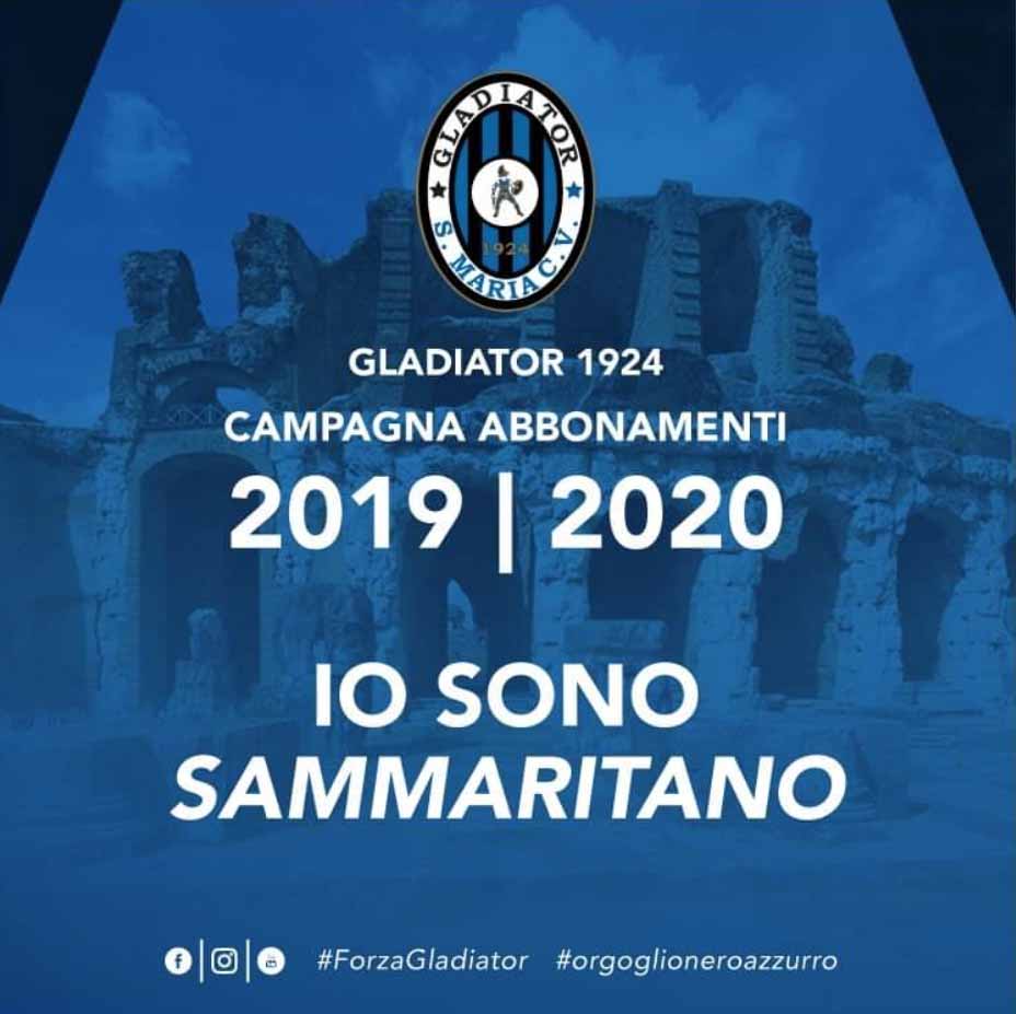 L’A.S.D. Gladiator 1924 promuove la campagna abbonamenti “Io sono Sammaritano” per la stagione 2019/2020 (hashtag di riferimento: #iosonosammaritano). Nell’ottica di dare risalto all’identità cittadina, la società neroazzurra dei presidenti Mattia Aveta e Giacomo De Felice lancia uno slogan che entri nel cuore di tutti i tifosi. Tre parole coniate per unire in un solo motto un intero popolo.
