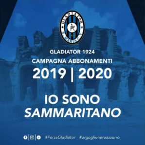 L’A.S.D. Gladiator 1924 promuove la campagna abbonamenti “Io sono Sammaritano” per la stagione 2019/2020 (hashtag di riferimento: #iosonosammaritano). Nell’ottica di dare risalto all’identità cittadina, la società neroazzurra dei presidenti Mattia Aveta e Giacomo De Felice lancia uno slogan che entri nel cuore di tutti i tifosi. Tre parole coniate per unire in un solo motto un intero popolo.