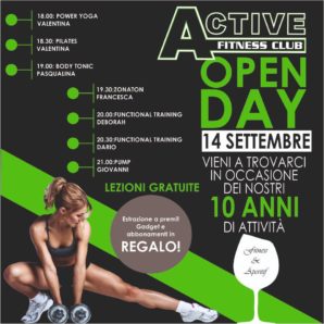 Sabato 14 Settembre per l’Active Fitness Club sarà un giorno speciale perché saranno 10 gli anni “all’attivo” dopo gli anni precedenti targati “I Love My Body”. Si festeggerà all’insegna del Fitness e del Wellness con un “Open Day” dove non mancherà proprio nulla, dal Pilates e lo Yoga per finire con Allenamenti funzionali e Pump.