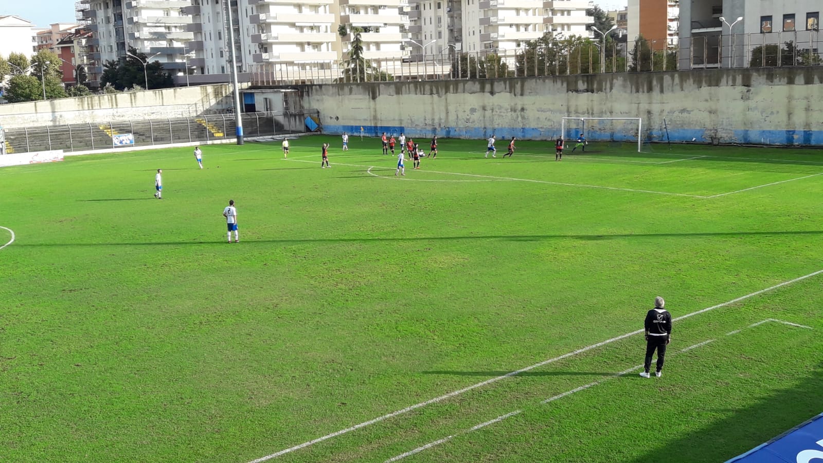IL PRIMO TEMPO – Dopo un violento nubifragio che si è abbattuto su Santa Maria Capua Vetere nella mattinata di oggi, L’inizio di gara è caratterizzato da un sole opaco. La prima chance la creano i padroni di casa al 5’ quando su un calcio d’angolo di Vitiello, Maraucci colpisce il pallone ii testa ma Leone è bravissimo con un colpo di reni ad alzare in angolo salvando i suoi. Come nelle precedenti partite, i primi minuti sono a forti tinte neroazzurre con i padroni di casa che pressano molto gli avversari, Al 9’ Del Sorbo lancia Di Finizio che dal limite calcia di destro ma non inquadra la porta sprecando una buonissima occasione. Due minuti dopo Ziello calcia in porta ma Leone respinge, sulla ribattuta Del Sorbo insacca ma l’arbitro aveva la bandierina alzata e annulla. Al 22’ la Nocerina so affaccia in avanti per la prima volta con Landri che calcia da fuori ma Zagari blocca facilmente. Le due squadre cercano il guizzo vincente ma non si scoprono più di tanto e giocano il pallone a centrocampo. Al 30’ si alza un campanile in area di rigore e Di Finizio prova con una rovesciata che però finisce alta di poco oltre la traversa. Superato il trentacinquesimo Borrelli è costretto ad eseguire la prima sostituzione per l’infortunio di Maraucci che viene sostituito da Ioio. Al 38’ la Nocerina ci riprova da fuori con Calvanese che raccoglie un rimbalzo e calcia al volo ma la mira è sballata. Al 42’ Iqnnini serve Ciampi che mette al centro per Soregente che viene anticipato da Sall in angolo. Sul corner Iannini si rende ancora pericoloso impattando di testa ma l’incornata di stampa sulla traversa, brivido sulla schiena dei tifosi del Gladiator che si salva in questa circostanza. Nel finale del tempo cross dalla destra per Del Sorbo che di destro calcia ma sfiora il palo. Al 46’ punizione in favore dei padroni di casa, se ne incarica Di Paola che calcia ma Leone devia in angolo.