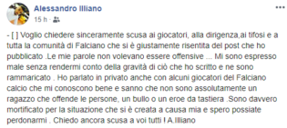 Questo il post finale: “Voglio chiedere sinceramente scusa ai giocatori, alla dirigenza,ai tifosi e a tutta la comunità di Falciano che si è giustamente risentita del post che ho pubblicato .Le mie parole non volevano essere offensive … Mi sono espresso male senza rendermi conto della gravità di ciò che ho scritto e ne sono rammaricato . Ho parlato in privato anche con alcuni giocatori del Falciano calcio che mi conoscono bene e sanno che non sono assolutamente un ragazzo che offende le persone, un bullo o un eroe da tastiera .Sono davvero mortificato per la situazione che si è creata a causa mia e spero possiate perdonarmi . Chiedo ancora scusa a voi tutti ! A.Illiano“
