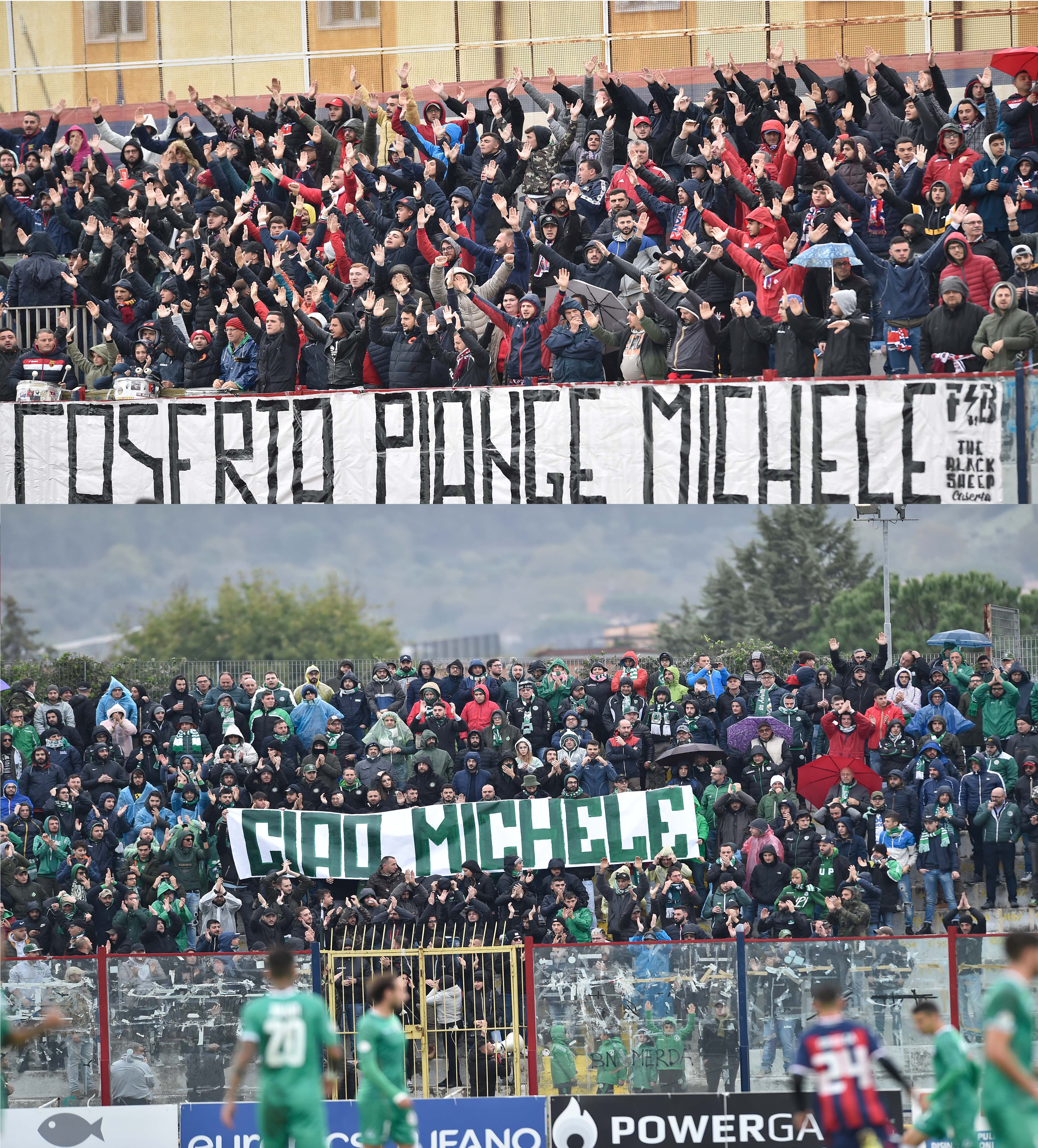E’ stato un derby in tono minore quello tra Casertana e Avellino. Sarebbe dovuta essere un’autentica festa vista l’amicizia fortissima tra le due tifoserie. Un gemellaggio che dura da oltre trent’anni che sarebbe potuto essere celebrato in maniera totalmente differente e invece la scomparsa di Michele Vergone, fratello di Vittorio, uno dei leader dei Fedayn Bronx, ha spento gli entusiasmi e i programmi della vigilia. Tifoserie composte sugli spalti senza scenografie nè striscioni. I primi cinque minuti di silenzio poi un coro per Michele e tutto il Pinto ad applaudire commosso. Il tutto proprio quando Starita ha portato in vantaggio la Casertana. Applausi scroscianti poi per lo striscione sollevato dagli avellinesi: un semplice ma significativo ‘Ciao Michele’ che ha bagnato gli occhi dei presenti. Un lungo e intenso applauso e tanti ringraziamenti per un popolo sensibile che ha sempre condiviso gli ideali dei casertani.