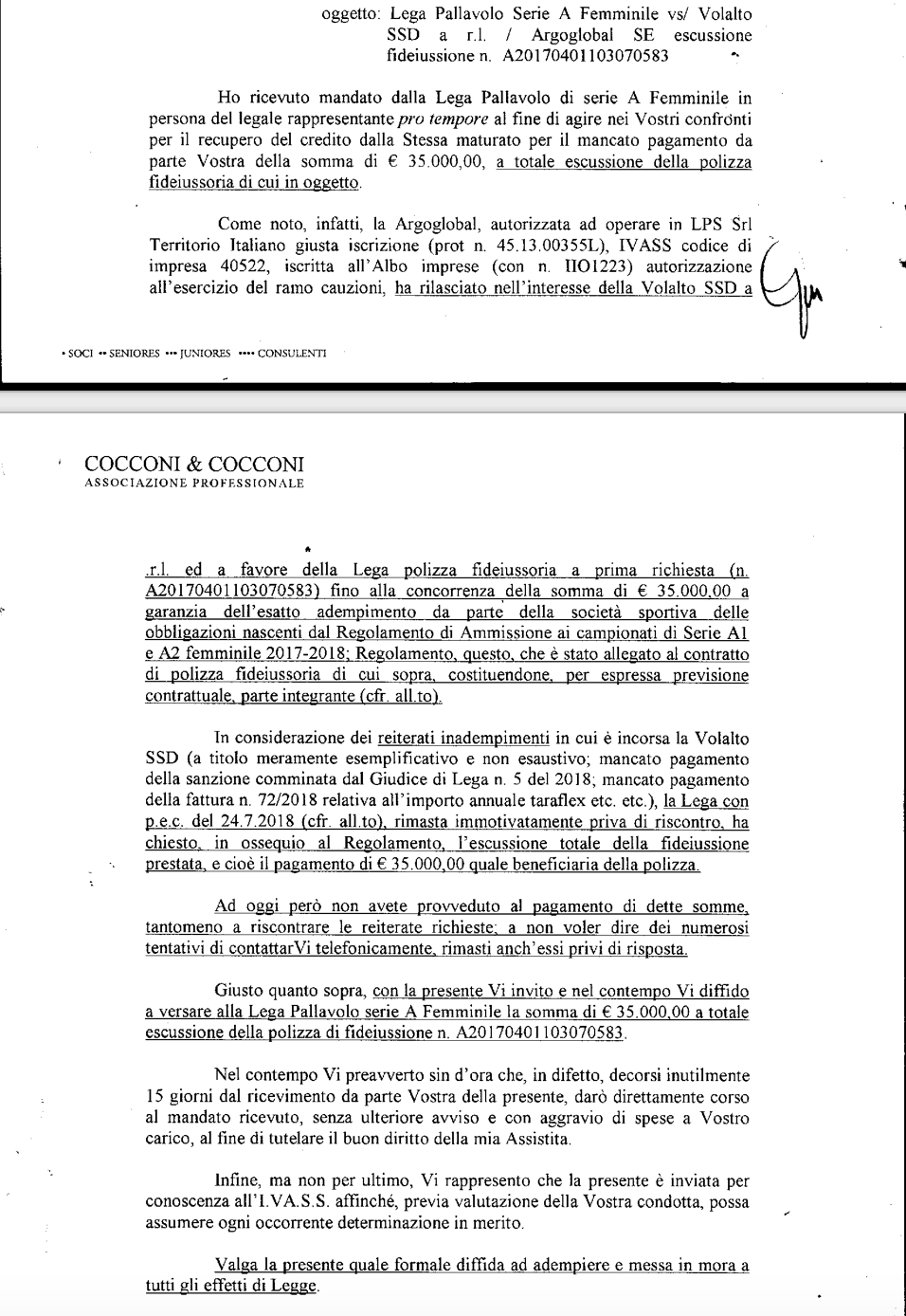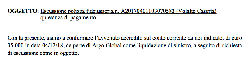 Questo come detto a marzo 2018. Signori la verità sembra proprio essere un’altra, anzi lo è. Abbiamo appreso attraverso atti depositati in tribunale quindi assolutamente pubblici, che attestano la non veridicità dei fatti riportati ormai ventuno mesi or sono. Dai documenti che alleghiamo di seguito si evince come non sia stata pagata la somma di 35000 euro alla Fipav relativa alla fidejussione della stagione in questione. E’ iniziato così un iter di recupero crediti da parte della Federazione che attraverso i propri legali ha chiesto il risarcimento. Ricordiamo inoltre, come sottolineato dallo stesso Nicola Turco nel comunicato del marzo 2018, che lo stesso Turco aveva ereditato la gestione del club rosanero da Barone e Attimonelli e dunque responsabile anche della gestione economica. In poche parole: le atlete di quella squadra non furono pagate da Turco (che invece aveva dichiarato a tutti di non avere pendenze) e si sono rivolte alla Fipav che le ha liquidate attingendo alla fidejussione precedentemente versata dalla vecchia dirigenza.