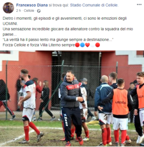 Lo stesso Diana ha espresso la propria felicità su Facebook: “Dietro i momenti, gli episodi e gli avvenimenti, ci sono le emozioni degli UOMINI. Una sensazione incredibile giocare da allenatore contro la squadra del mio paese…