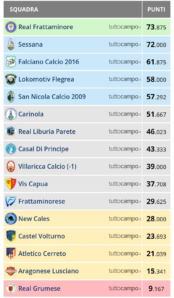PRIMA CATEGORIA. Nel girone A ad esempio, la Sessana che all’ultima giornata occupava la prima posizione, in virtù dell’algoritmo, verrebbe scavalcata dalla Real Frattaminore che ha una partita in meno.