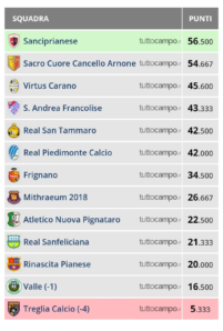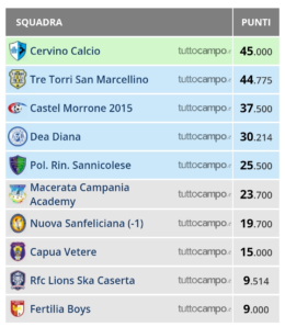 SECONDA CATEGORIA. Nel girone A , anche l’altra squadra casertana, il Sacro Cuore Cancello Arnone, potrebbe vedersi soffiare il titolo e la promozione dalla Sanciprianese che con l’algoritmo terminerebbe il campionato davanti ai casertani.