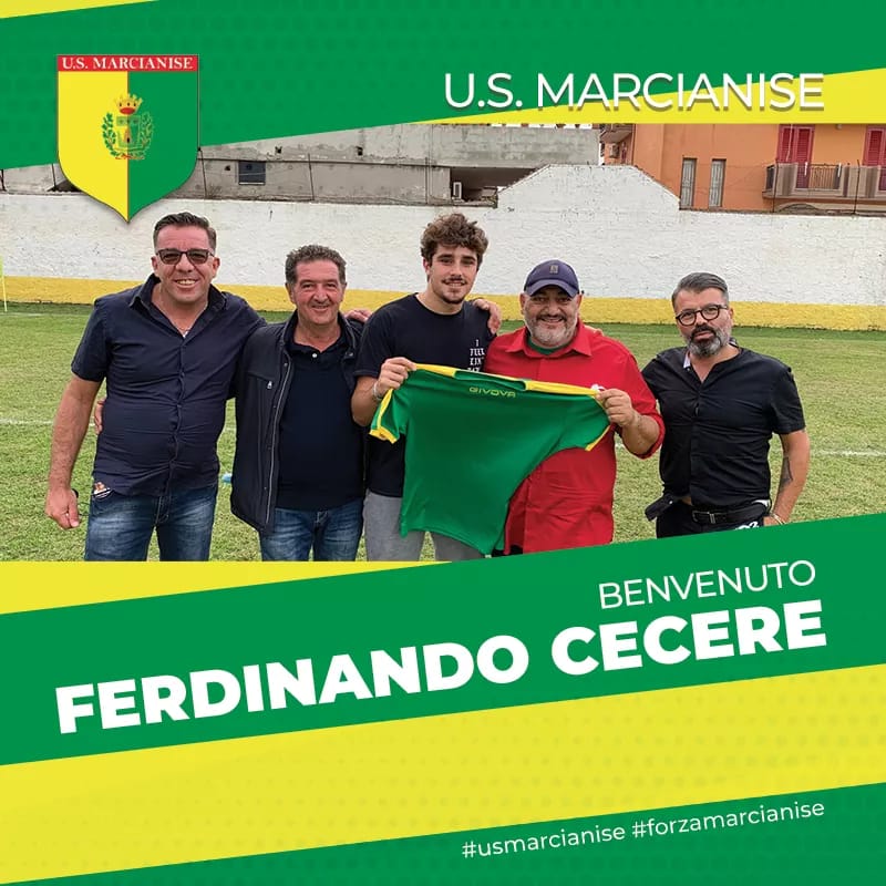 FERDINANDO CECERE. Centrocampista classe 2001, esegue tutta la trafila con la maglia della Real Casarea prima di approdare nella Juniores del Giugliano, dove si mette in mostra tanto da essere portato in prima squadra dove disputa due campionati di Eccellenza ed uno di Serie D. Giunto in prestito all’Albanova, disputa due ulteriori stagioni in Eccellenza prima di approdare a Marcianise.