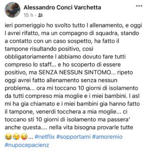 AVERSA – Alessandro Varchetta è risultato positivo al Covid-19. E’ lo stesso difensore del Real Aversa ad annunciare il contagio in un post pubblicato ieri sera su facebook, con una decisione frutto della responsabilità e della maturità. Presente tra i cinque atleti positivi del team normanno, l’esperto centrale difensivo ex Turris e Frattese ha scelto di fare coming out, al fine di tutelare anche le persone con cui ha interagito negli ultimi giorni. Ed è proprio su questo punto che spesso si divide l’opinione della gente. C’è chi preferisce mantenersi nei limiti della privacy, onde evitare preoccupazioni, e c’è chi come Alessandro Varchetta che ‘vuota il sacco’ e parla liberamente del contagio. E’ ovvio che ognuno decide in base alla propria coscienza ma va sottolineato che scelte come quelle di Alessandro permettono di mettere a conoscenza gli altri della positività e prendere le dovute precauzioni, come l’esame del tampone e del test seriologico. Ma oltre alla serietà non manca mai un pizzico di ironia insita nei napoletani: “Netflix sopportami”: un modo per alleggerire l’assenza sul terreno di gioco. L’augurio è quello di una pronta guarigione e di un rapido ritorno in campo per difendere i colori del Real Aversa.