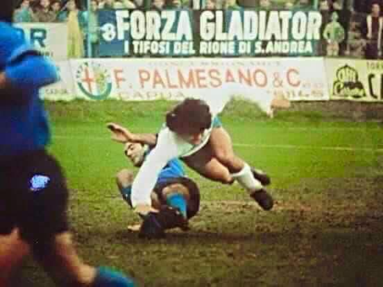 LA SCIVOLATA. Chi c’era quel giorno, rimase incantato. Sugli spalti ed anche in campo, come ammise Nello Di Costanzo: “Durante l’amichevole contro il Napoli di Maradona, ci guardavamo il riscaldamento di Diego che faceva il funambolo, infatti in partita avevamo paura di affrontarlo per non fargli male”. Di tanti lo scatto più famoso è quello che ritrae Massaro in scivolata su Maradona che cadde per terra, con lo striscione in bella mostra dietro con la scritta “Forza Gladiator”. Tanti tifosi erano preoccupati, tanto che uno disse “Massaro, vai piano con Diego“. Perché in quell’istante non si era solo tifosi del Gladiator e del Napoli, ma tutti volevano tener cura di una gemma preziosa come lui, Diego Armando Maradona.