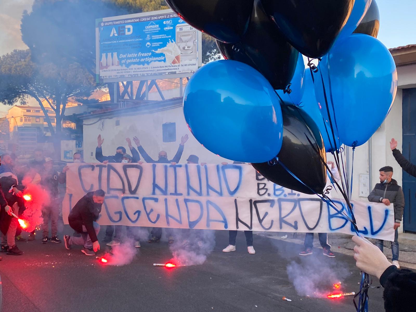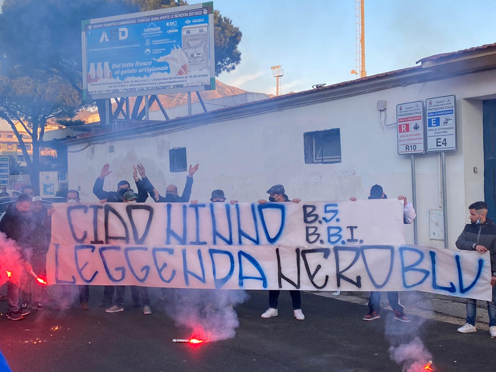 DAVANTI AL “PICCIRILLO”. Intorno alle 16 numerosi sostenitori, grandi amici e soprattutto compagni di avventure dello storico tifoso sammaritano in ogni trasferta, lo hanno ricordato con uno striscione “Ciao Ninno, leggenda neroblu”, con fumogeni, palloncini a tinte neroazzurre e vari cori, “Vecchio cuore neroblu non ti lasceremo mai” e “Ninno sempre presente”. Se la funzione religiosa non è stata effettuata per ragioni pandemiche, l’ambiente sportivo sammaritano ha dato vita alla sua funzione sentita. Dove non è riuscita la religione, è riuscita la fede calcistica. Pianti e commozione nei volti di ognuno per una persona che, in ottanta anni di vita, ha dedicato la sua passione ai colori neroazzurri, prima da calciatore delle giovanili e poi da tifoso sfegatato. Il suo amore per il Gladiator vivrà in eterno.