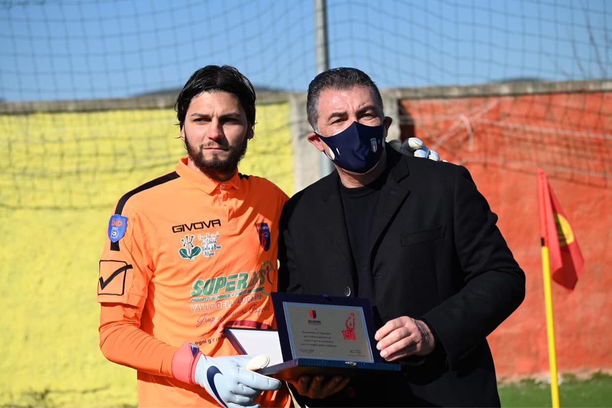 CESA – Bernardino D’Agostino è sempre più un simbolo della Gelbison. Nella gara di domenica scorsa contro la Polisportiva Santa Maria del Cilento, il portiere di Cesa ha collezionato la presenza numero 150 con la compagine di Vallo della Lucania che milita nel girone I di Sere D. Il presidente Maurizio Puglisi, a nome dell’intera società, gli ha tributato una targa per il traguardo che di fatto dà sempre più valore all’esperienza del calciatore casertano con il team rossoblu.