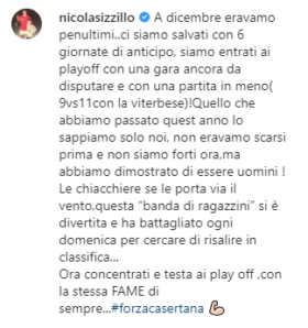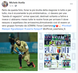 Parola alla mediana. Sulla stessa falsa riga i messaggi dei due centrocampi Mattia Matese “A metà dicembre la “BANDA DI RAGAZZINI” era penultima.. Sicuramente l’esperienza è poca, gli errori tecnici sono stati tanti, qualche atteggiamento sbagliato c’è stato. Ma c’è stato anche AMORE.. verso la maglia, la società, i tifosi e soprattutto nei confronti del nostro fantastico lavoro. Dando tutto in ogni singolo allenamento, su ogni singolo pallone, c’è l’abbiamo fatta! Abbiamo raggiunto la salvezza con 6 giornate di anticipo. Come ciliegina sulla torta ci siamo regalati e abbiamo regalato alla famiglia D’agostino e a tutti i tifosi qualcosa di veramente inaspettato.. NOI CE NE ANDIAMO AI PLAY OFF !!!!!!” e Nicolas Izzillo “A dicembre eravamo penultimi..ci siamo salvati con 6 giornate di anticipo, siamo entrati ai playoff con una gara ancora da disputare e con una partita in meno ( 9vs11con la viterbese)! Quello che abbiamo passato quest’anno lo sappiamo solo noi, non eravamo scarsi prima e non siamo forti ora,ma abbiamo dimostrato di essere uomini ! Le chiacchiere se le porta via il vento, questa “banda di ragazzini” si è divertita e ha battagliato ogni domenica per cercare di risalire in classifica… Ora concentrati e testa ai play off ,con la stessa FAME di sempre…#forzacasertana 💪🏻”