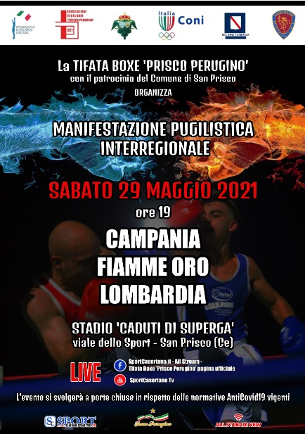 Altro appuntamento con il piugilato firmato Tifata Boxe Team Perugino. Sabato 29 maggio presso lo stadio Comunale ‘Caduti di Superga’ di San Prisco si terrà una riunione pugilistica interregionale con pugili della Campania, Lombardia e gruppo sportivo Fiamme Oro. Saranno undici i match totali (9 con 2 fuori programma) che vedranno pugili molto interessanti sul ring che verrà posto sotto la tribuna, lato spogliatoi, come in occasione della scorsa manifestazione di settembre. La riunione sarà trasmessa anche questa volta dal nostro portale sulle pagine Facebook SportCasertano.it e All Stream ed anche sul canale Youtube Sportcasertano Tv.