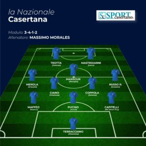 A CENTROCAMPO. Il giocatore che dà maggior qualità al centrocampo è Camillo Ciano di Marcianise. Il fantasista del Frosinone in Serie B è stato arretrato al ruolo di regista e potrebbe dare la sua mano. A sorreggere la sua qualità Mario Coppola di Aversa, capitano del Potenza nel girone C di Serie C, mentre sugli esterni due schegge del Grosseto, sempre in Serie C, Davide Merola di Santa Maria Capua Vetere e Raffaele Russo di Vitulazio. In panchina sono presenti le forze fresche di Francesco Finocchio di Casagiove nella Luparense, Luca Ricciardi di Cellole che gioca nel Rimini, Francesco Alvino di Maddaloni nel Nola, Antonio Carnevale di Caserta nel Picerno, Clemente Crisci di San Felice a Cancello nell’ACR Messina e Kevin Miranda di Dragoni che milita nella Primavera del Sassuolo.