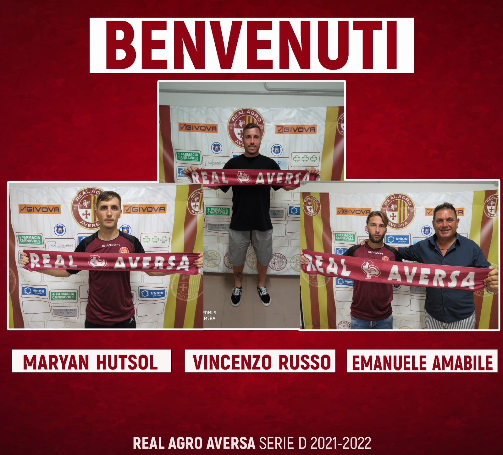 Il Real Agro Aversa, nella persona del Presidente Pellegrino e del Ds Filosa, è lieta di comunicare di aver definito il trasferimento dei calciatori Vincenzo Russo, Maryan Hutsol ed Emanuele Amabile. Tre atleti in grado di alzare il livello qualitativo della squadraVincenzo Russo difensore centrale classe ’85 rappresenta una vera chicca in termine di esperienza e professionalità in questa categoria. Il curriculum è di spessore : Santa Maria Mole, Torrecuso, Campania Piscinola, Pomigliano, Arzanese, Campobasso, Manfredonia, Ebolitana, Sorrento, Taranto ,Nocerina e Nola con cui ha disputato l’ultima stagione. Esperienza e dinamismo a disposizione del collettivo.
