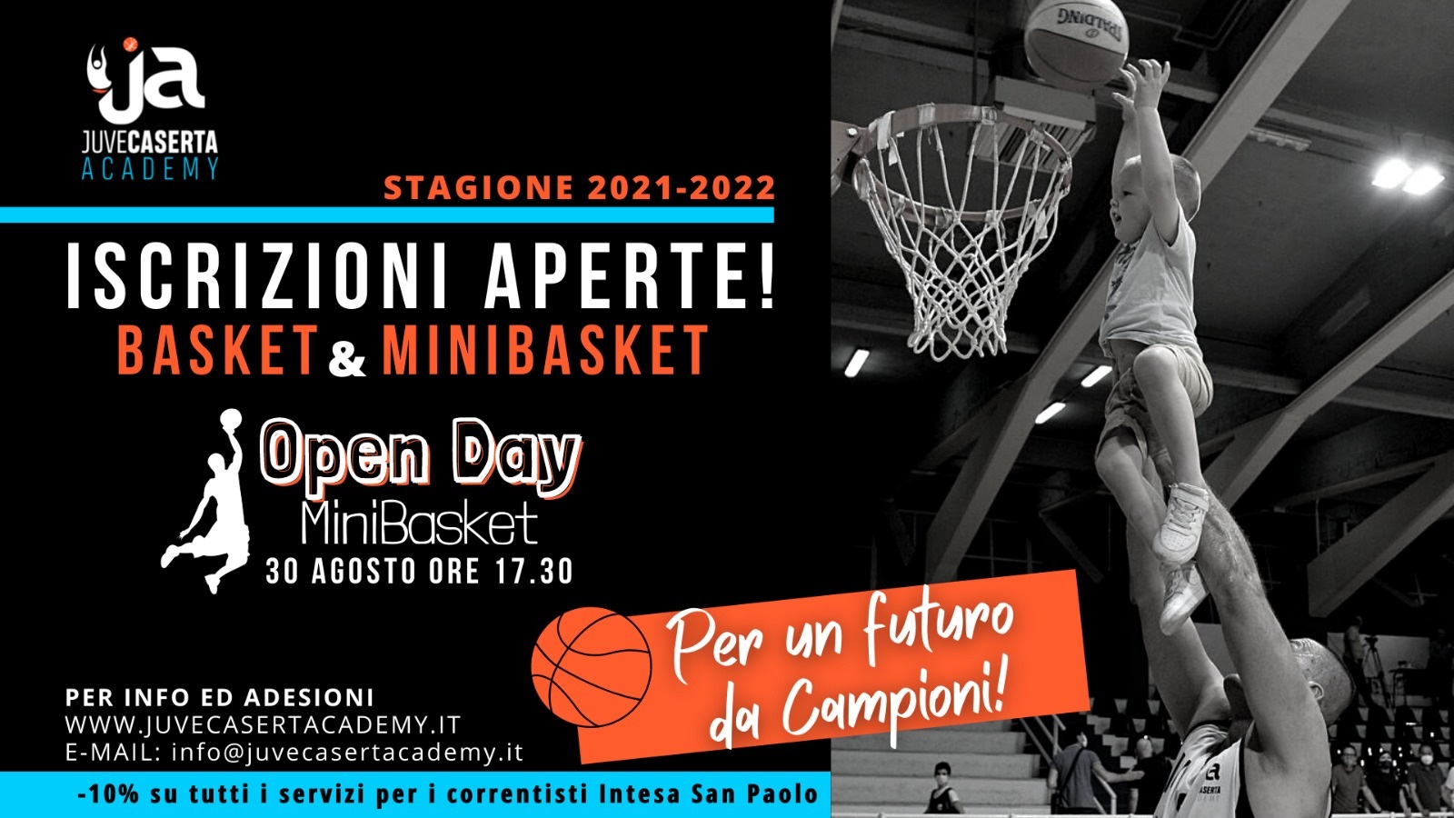 Ci sarà l’intera prima squadra della Ble con Nando Gentile e lo staff tecnico ad accogliere vecchi e nuovi mini-atleti del Centro Minibasket della Juvecaserta Academy. L’Open Day della stagione 2021/22 è fissato per le ore 17.30 di lunedì 30 agosto presso il Palasport di viale Medaglie d’oro, dove saranno presentati i programmi e lo staff del Centro, che ha rafforzato quest’anno la propria struttura, che ha in Lidia Tomasiello la responsabile dell’area tecnica ed in Giuseppe Farina il responsabile organizzativo. Saranno loro, con la dirigente Laura Viviana Felicetti, a coordinare le attività del centro ed il lavoro degli istruttori.L’incontro di lunedì tende a creare un primo contatto tra tutti i bambini che scelgono lo sport del basket come primaria attività motoria e ludica, ma servirà anche per condividere con i genitori una serata all’insegna dell’amicizia e del divertimento nell’ambito del progetto Juvecaserta Academy “Per un futuro da campioni”.