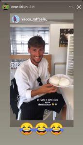 IL SIPARIETTO. Sul noto social, di proprietà da pochi anni di facebook, Vacca (da non confondere con l’ex rossoblu Antonio Junior) ha postato una fotografia con un piatto di mozzarelle ed ha scritto “Ci vuole il latte nella vacca, Evan Cunzi“. Chiaro il riferimento scherzoso al suo cognome, così poi Cunzi ha ripubblicato la story, mettendo tante faccine sorridenti. Fino a qui nulla di strano, perché le mozzarelle possono essere mangiate dappertutto e non per forza devono essere riferite al lavoro di Giuseppe D’Agostino. Quindi qual è l’indizio vi chiederete? Ecco, ve lo spieghiamo. Nella fotografia, alle spalle di Vacca, si nota un orologio de “La Pagliara”, che si trova all’interno di una delle sedi della rinomata attività imprenditoriale del presidente.