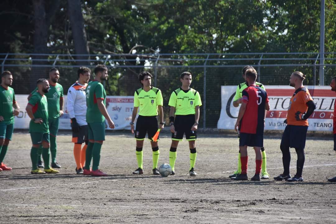 PRIMO TEMPO. Gara divertente nella prima frazione di gioco, alla mezz’ora il punteggio si sblocca, Cangiano riceve palla spalle alla porta e dal limite con un rasoterra beffa Porcaro che non può far nulla, 1-0 Teano. Il vantaggio dei sidicini dura però soltanto sette minuti, al 37′ infatti, l’arbitro concede un rigore in favore del Cellole per un fallo di mano di un difensore rossoverde. Dagli undici metri si presenta Vincenzo Russo che batte Bertolino realizzando il classico gol dell’ex che chiude la prima parte di gara. A 38 anni suonati, il bomber ex Casagiove e Teano gonfia ancora la rete e segna il goal del pareggio dei suoi.