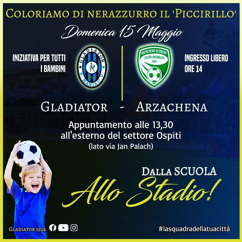 SANTA MARIA CAPUA VETERE – Far sbocciare l’amore tra gli studenti e la prestigiosa maglia neroazzurra: è questo l’obiettivo dell’iniziativa “Dalla scuola allo stadio” ideata dal Gladiator 1924 S.S.D. a.r.l. in collaborazione con il giornalista Domenico Vastante. Domenica i calciatori neroazzurri saranno accompagnati da tantissimi piccoli gladiatori ed i loro genitori: un sostegno in più per la partita decisiva per la salvezza contro l’Arzachena. Per l’occasione la società donerà agli studenti cappellini e bandierine, così da lasciare un bellissimo ricordo in ogni piccolo tifoso e realizzare una stupenda coreografia per il ritorno del Gladiator allo stadio “Mario Piccirillo”. In questi giorni è in corso la promozione dell’iniziativa presso gli istituti scolastici della città, al fine di coinvolgere quanti più studenti e festeggiare insieme la salvezza del Gladiator.