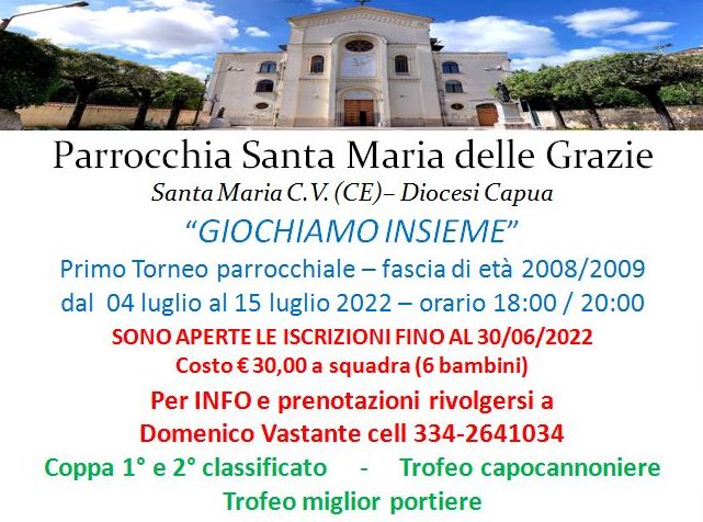 SANTA MARIA CAPUA VETERE – La Parrocchia Madonna delle Grazie di Santa Maria Capua Vetere organizza il Primo Torneo Parrocchiale “Giochiamo Insieme”. Attraverso il calcio è possibile veicolare tanti valori umani e cristiani, a cui si aggiungono concetti fondamentali come la sana aggregazione, il fair play, il divertimento, fare sport, l’utilizzo degli spazi riservati ai bambini e ragazzi.
