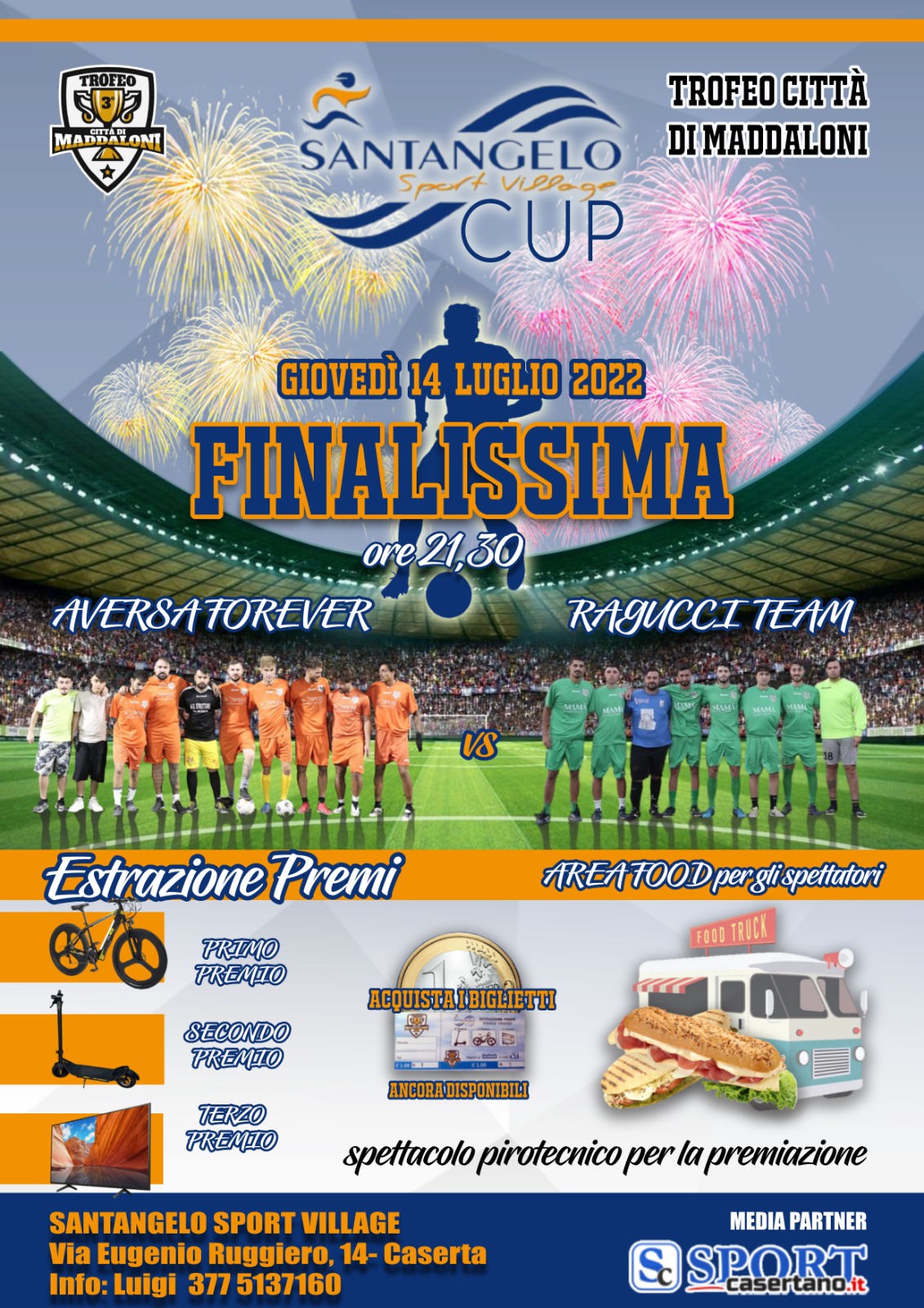 Ci siamo! Giovedì 14 luglio alle 21.30 presso il Santangelo Sport Village in Via Eugenio Ruggiero a Caserta, ci sarà la finalissima del Trofeo Città di Maddaloni Santangelo Cup. A sfidarsi l’Aversa Forever e il Ragucci Team. In palio 5000 euro per i vincitori, coppe e trofei miglior portiere e capocannoniere. Gli organizzatori hanno pensato a tutto organizzando un’area food per gli spettatori, un meraviglioso spettacolo pirotecnico per la premiazione e una invitante estrazione con tre premi senza precedenti. Si possono acquistare i biglietti al costo di un solo euro che permetteranno di vincere una mountain bike, un monopattino elettrico o un televisore 52 pollici. In campo sarà battaglia perché sia l’Aversa Forever che il Ragucci Team possono contare su giocatori di grande esperienza. Pronostico aperto a qualsiasi risultato. Non resta che attendere ancora qualche ora e poi finalmente ci sarà il calcio d’inizio che concluderà una kermesse molto seguita. L’incontro sarà ripreso dalle nostre telecamere con sintesi e interviste subito dopo. Vi aspettiamo.