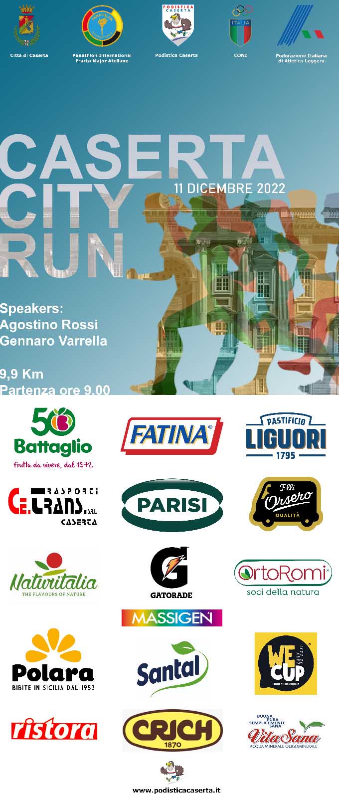 Manca una solo settimana alla Caserta City Run, gara podistica di 10 km in programma domenica 11 dicembre 2022 nella città di Caserta. Possiamo già applaudire l’organizzazione della Podistica Caserta che ha già vinto la sua corsa infatti sono già stati raggiunti 600 iscritti che correranno domenica prossima sulle strade di Caserta.