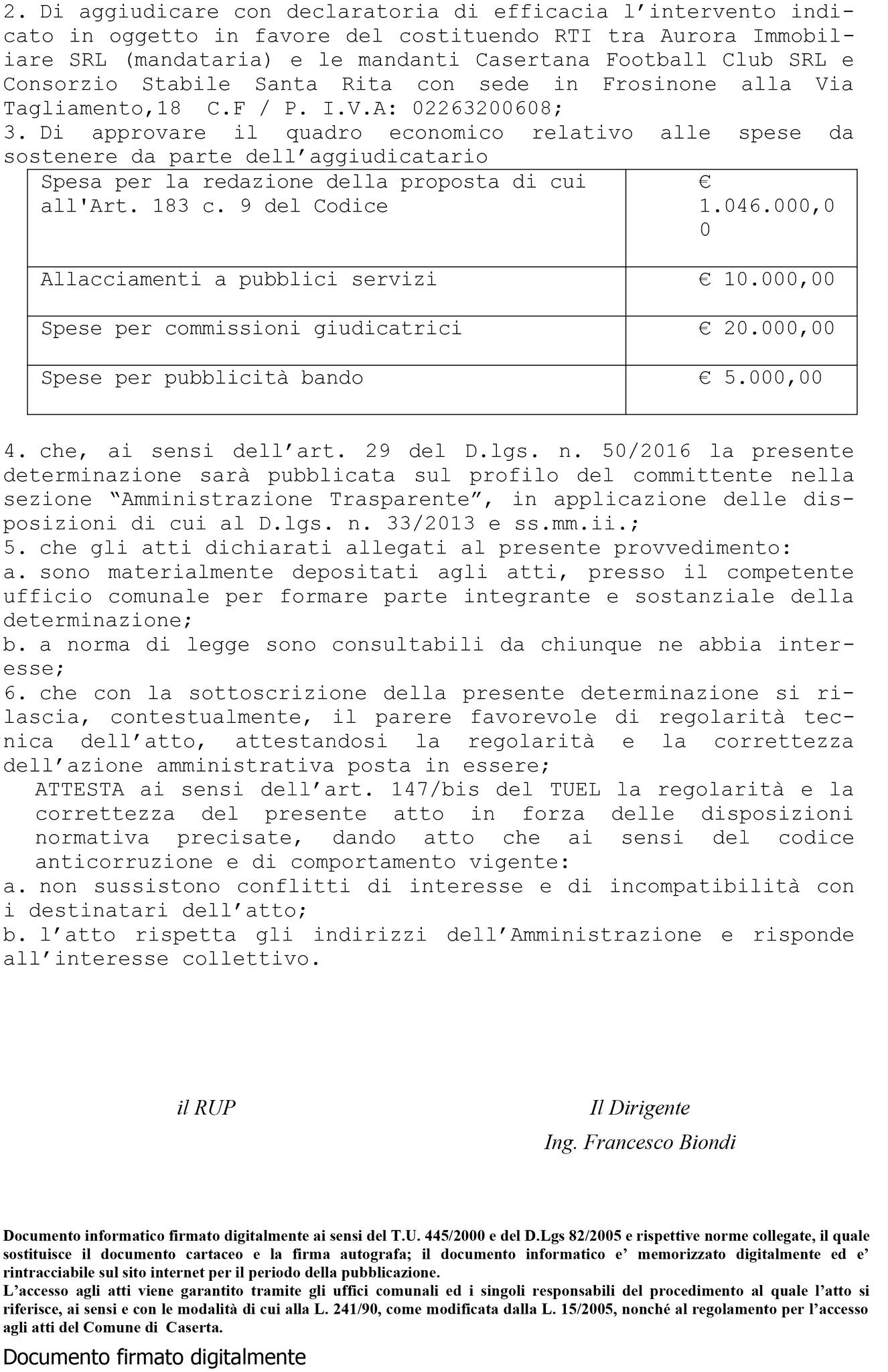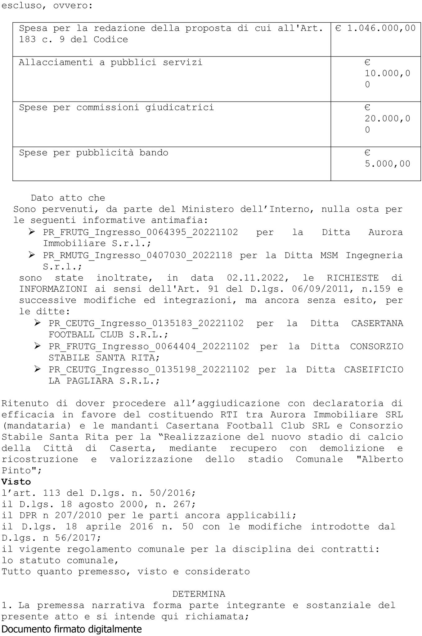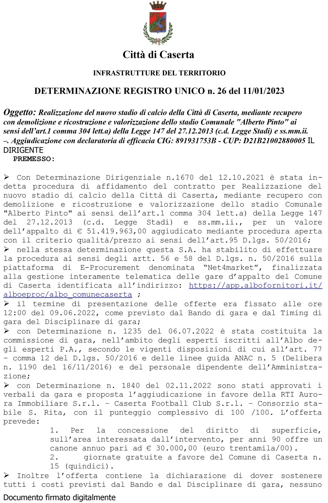 Di seguito la determina del Comune di Caserta in data 11/01/2023.
