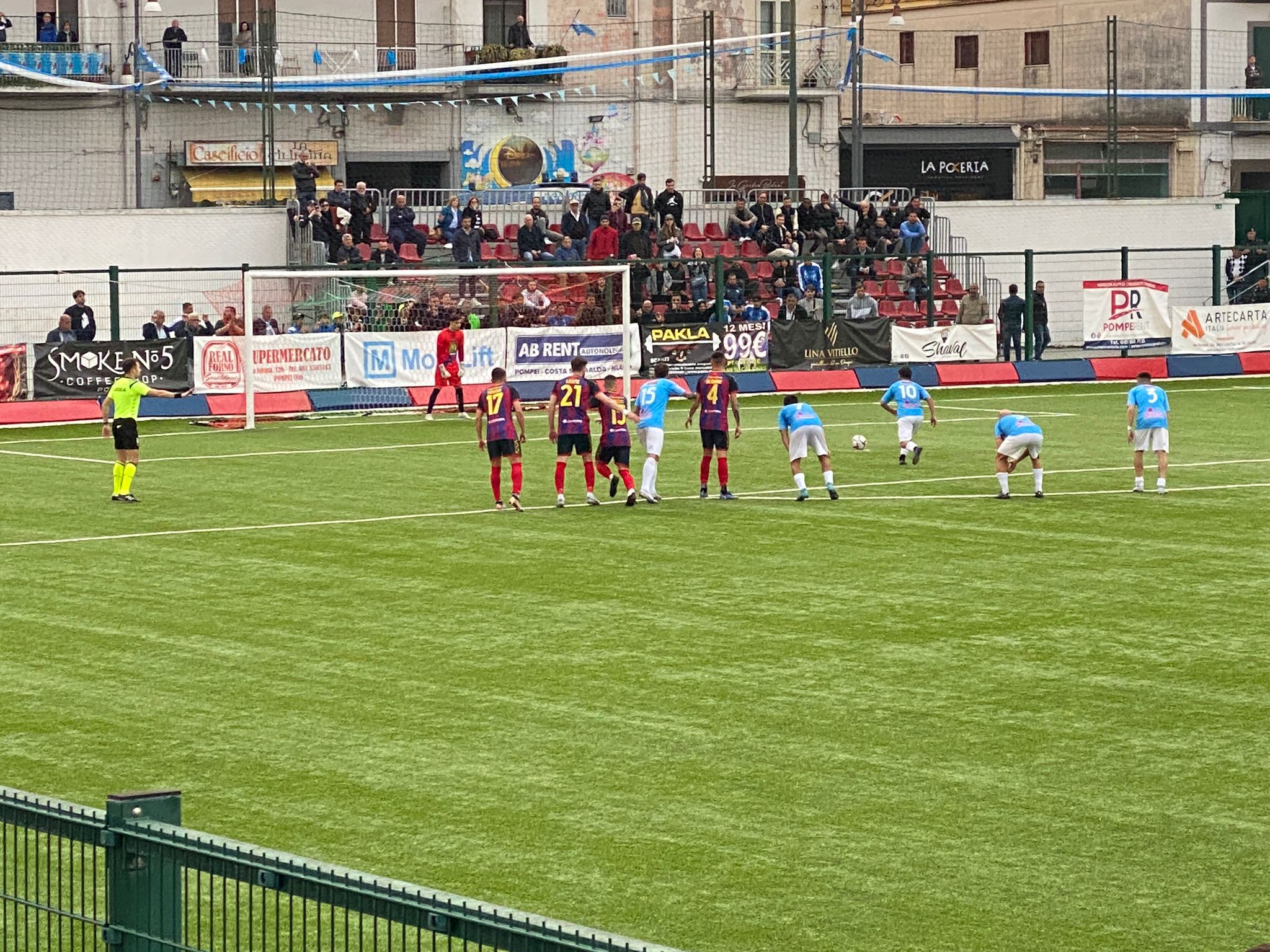 TEMPI REGOLAMENTARI. Il primo brivido lo crea la formazione padrone di casa al 4′, una palla che sembrava innocua si rivela pericolosa con Tedesco che crossa in maniera tesa al centro, la sfera attraversa tutta l’area senza che nessun centravanti la tocchi. Il primo tempo mette in mostra una partita molto maschia che si gioca prevalentemente a centrocampo e che non regala forti emozioni. La ripresa è più vivace e l’Albanova spinge con più insistenza. 48′ cross di Sparano dalla sinistra per la testa di Mascolo che non inquadra lo specchio. Si vive di fiammate e al 73′ l’Albanova ha la chance per scrivere la storia e portare a casa la vittoria ma la sciupa: contropiede dei casalesi con Cestrone che riceve ed entra in area, l’attaccante supera il portiere ma la palla si infrange solo contro la traversa, mani nei capelli per il folletto casertano che si divora il goal del possibile vantaggio. Ancora ospiti all’85’ la sfera termina sui piedi di Fontanarosa che non ci pensa su due volte e calcia al volo, la sua conclusione però è strozzata e termina a lato. Il Pompei risponde al minuto 89′ Di Paola pesca Malafronte tra le linee, il giocatore si presenta solo contro Vivace che si distende e con il piede effettua un vero e proprio miracolo mantenendo lo 0-0 e consegnando l’esito ai tempi supplementari.