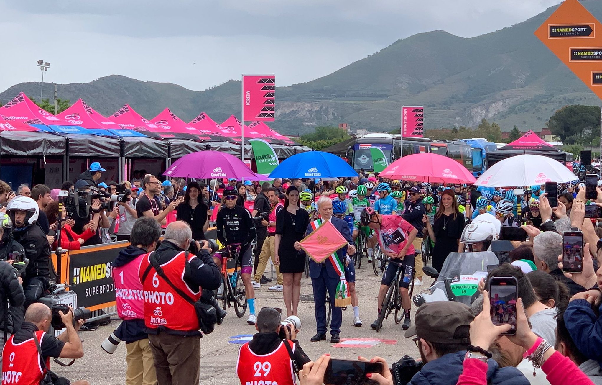 CAPUA – Il Giro d’Italia ha sempre il suo effetto. Nella mente riecheggiano le gesta di atleti del calibro di Moser, Coppi, Bartali, Pantani, Cipollini, ragion per cui tante persone della provincia di Caserta hanno riempito sia il Villaggio Rosa che le strade percorse dalla Carovana Rosa (CLICCA QUI PER LEGGERE I COMUNI TOCCATI). Ieri mattina, nonostante la pioggia, una folla entusiasta ha espresso tutto il proprio affetto per i campioni attuali del ciclismo che sono partiti da Capua alle 11.15 esatte (a dare il via con la bandierina rosa il sindaco capuano Adolfo Villani) e sono arrivati intorno alle 17.30 sul Gran Sasso d’Italia a Campo Imperatore.